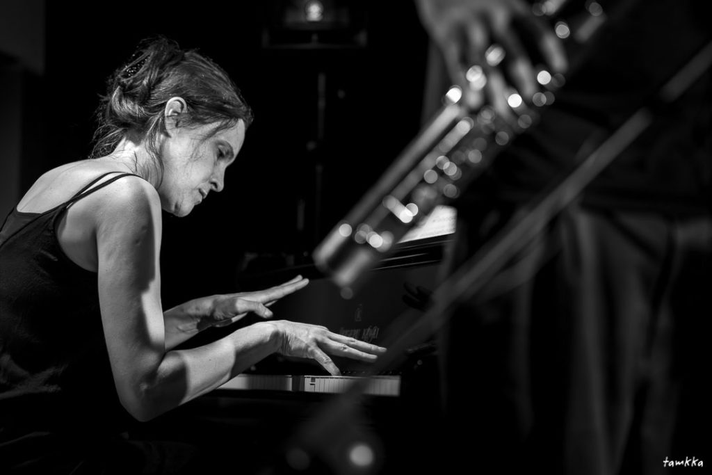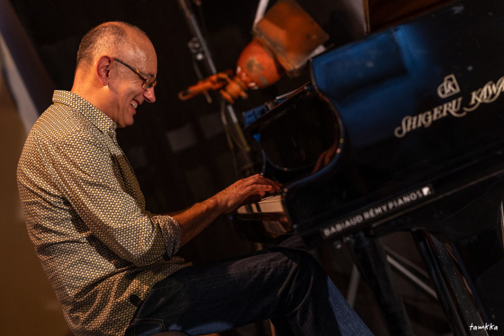 Didier Fréboeuf commence par une ritournelle, berçante, appuyée sporadiquement par la contrebasse de Guillaume Souriau et quelques griffures de la batterie de Christophe Beausset. Le son dissone peu à peu, laissant s’immiscer l’étrange, main gauche de Didier maintenue pour que s’évade la droite, la batterie frémit, la contrebasse dessine son esquisse, des triolets entêtés sur le clavier réengagent la dynamique, l’accélération répétitive attrape le swing, la contrebasse et la batterie s’en saisissent. Les trois sont bien au centre de la course, on sent des éclats de joie dans les mains de Didier Fréboeuf avant de relancer le tempo. Un temps soudain de pause, que les notes les unes des autres prennent appui sur les silences pour swinguer entre elle, douceur et toucher à la Bill Evans, quelques accords justement disséminés sur le clavier, à faire fondre de plaisir.