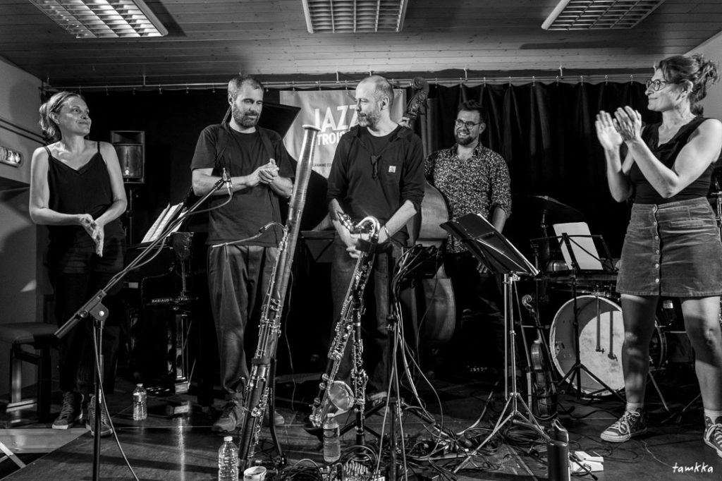 Bête et féroce est un morceau cahotant qui porte bien son titre, une musique intermittente…hachée, la batterie de Guilhem Meier en percussionne… Les compositions volontairement foutraques conduisent l’énergie de chacun. Le solo d’Anne Quillier se construit comme un millefeuille, des volutes superposées, peu à peu suivie par le violon suffoquant de Fany Fresard, le choix de la désarticulation pour une cacophonie mélodieuse. Le piano frémit parfois, bruisse. Tous se rejoignent pour haleter.