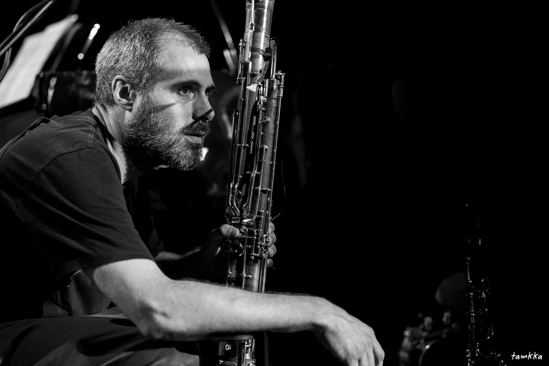 En Echo, un commencement métallique pour le violon et la clarinette basse, le basson de Nicolas Mary allonge ses sons, la contrebasse de Michel Molines swingue lentement, le piano incruste sa gestuelle contemporaine, presqu’en valse lente.