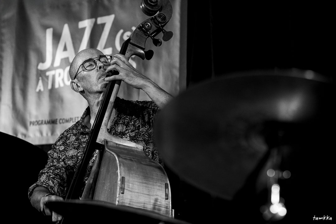 Quatre notes, et le clavier de Didier danse déjà. Les mains sur la batterie pour Christophe, c’est physique le tango de Drôles d’oiseaux, mais la jambe s’attarde, suspendue pour mieux multiplier ses circonvolutions dans les doigts habiles de Didier Fréboeuf. Tourbillons, déhanchés improbables, le tango brille, tourne et retourne, pas assurés de la contrebasse de Guillaume Souriau qui prend ensuite la main pour poursuivre la chorégraphie.