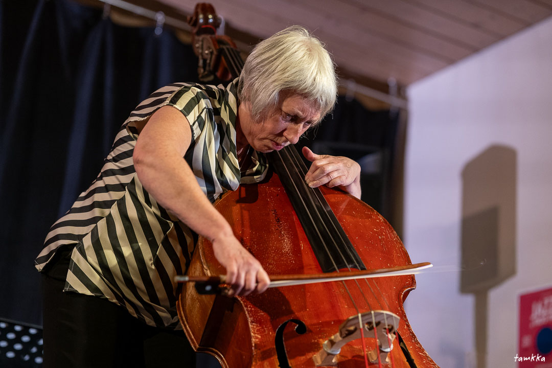 Une contrebasse dans les nimbes, veloutée, laisse s’immiscer la clarinette basse de Sylvain Kassap, d’abord sporadique puis vibrionnante, les deux se retrouvent par endroits, précis dans leur complicité. Pourtant, chacun son langage, Une cure d’inefficacité, l’obscurité à pas menus par la contrebasse d’Hélène Labarrière, les couleurs et tessitures variées avec la clarinette. Ils n’ont de cesse de se rejoindre et d’approcher leurs sons.