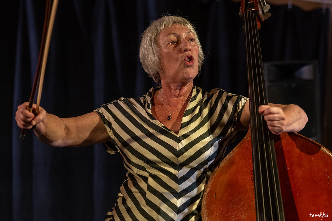 La musique sonne puis se tait, des ruptures nécessaires pour que s’opposent longuement les sons, logorrhées circulaires pour la clarinette, Sylvain Kassap découpe et dédouble sa clarinette, une conversation obstinée pour la contrebasse d’Hélène Labarrière. L’archet vient entêter l’instrument, matière à des souffles venus des Andes, peut-être bien, la contrebasse s’enfonce dans sa répétition et libère la fantaisie d’une flûte frivole. Des murmures musicaux de part et d’autres pour s’entendre davantage encore, faire lien dans les différences et partager ainsi, voire se ressembler. Des sortes de chants venus d’ailleurs semblent naître alors, cheminer et s’évaporer. La contrebasse lance des sons, tour à tour, qui s’élancent à l’infini ou s’estompent, un swing en souterrain, devenu prétexte à la clarinette.