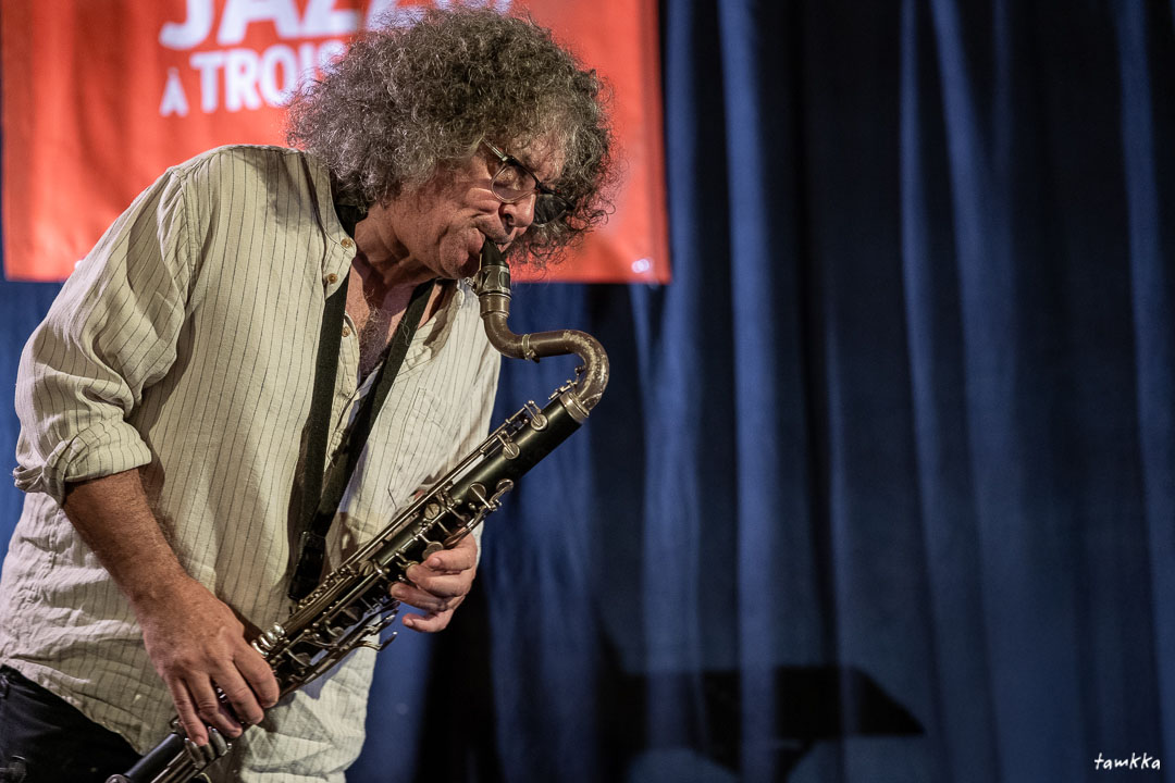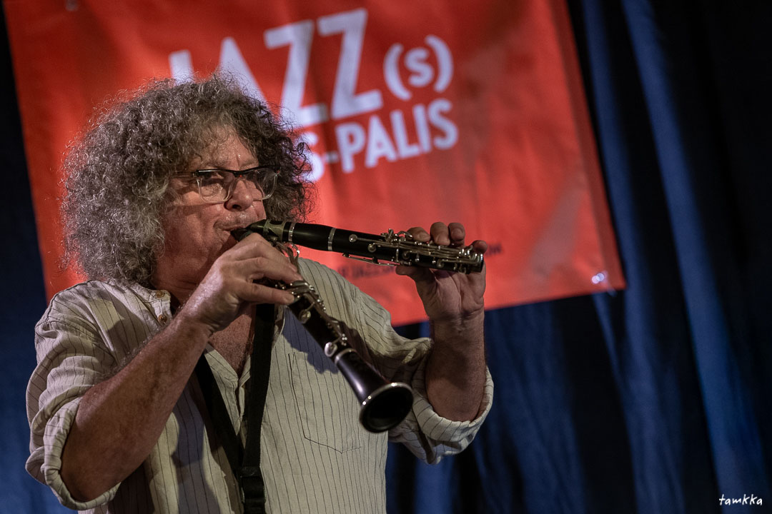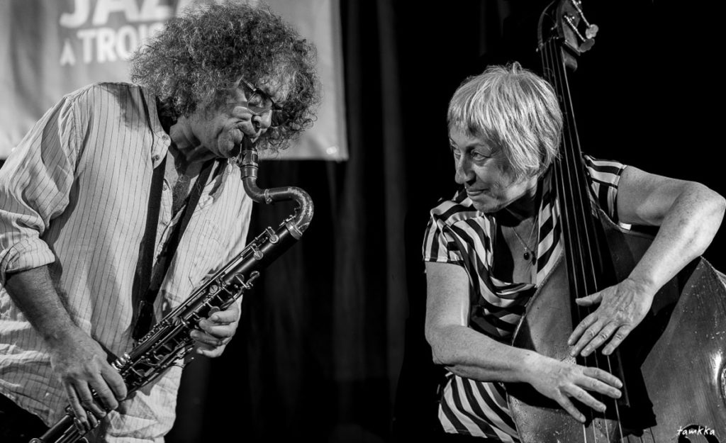 Des sons longs pour la contrebasse d’Hélène Labarrière, des trépidations, des frétillements pour la clarinette basse de Sylvain Kassap suivis d’irisations, et désir de labyrinthe à traverser précipitamment, des balles de caoutchouc dans des tuyaux en plastique, anarchiques, oui, toujours à la clarinette basse ! Et en réponse un son plein, un air qui voudrait dire sa belle lassitude, ses espoirs, son exténuation, You… La contrebasse rebondit à son tour grâce à l’extrémité toute ronde d’une baguette.
