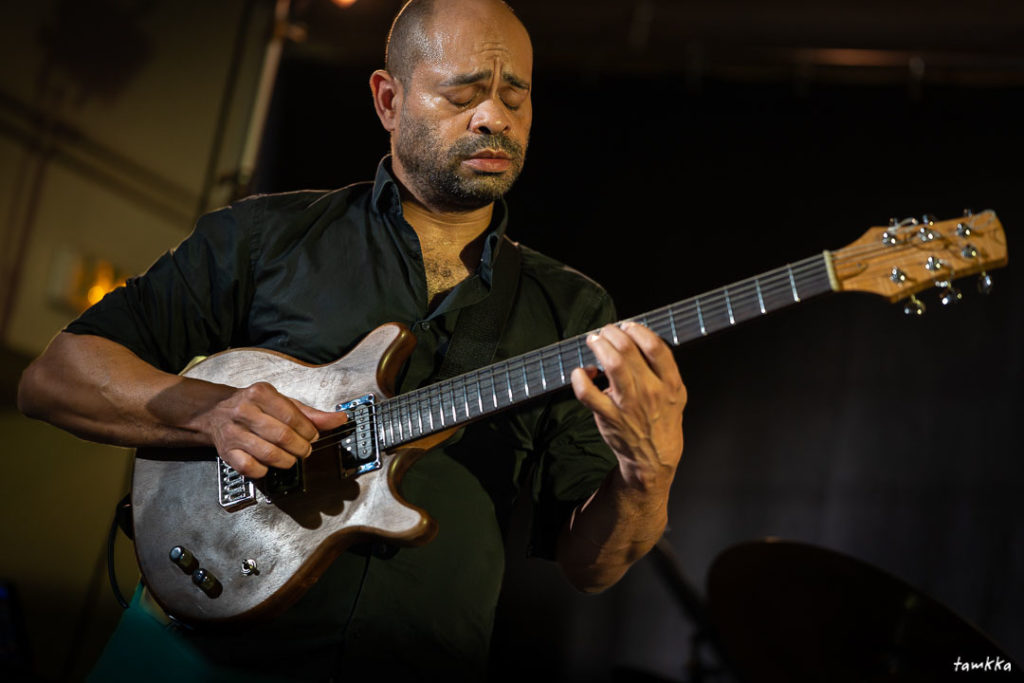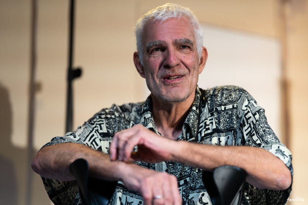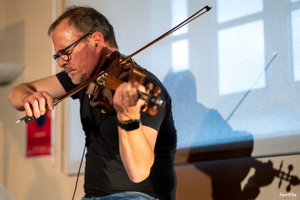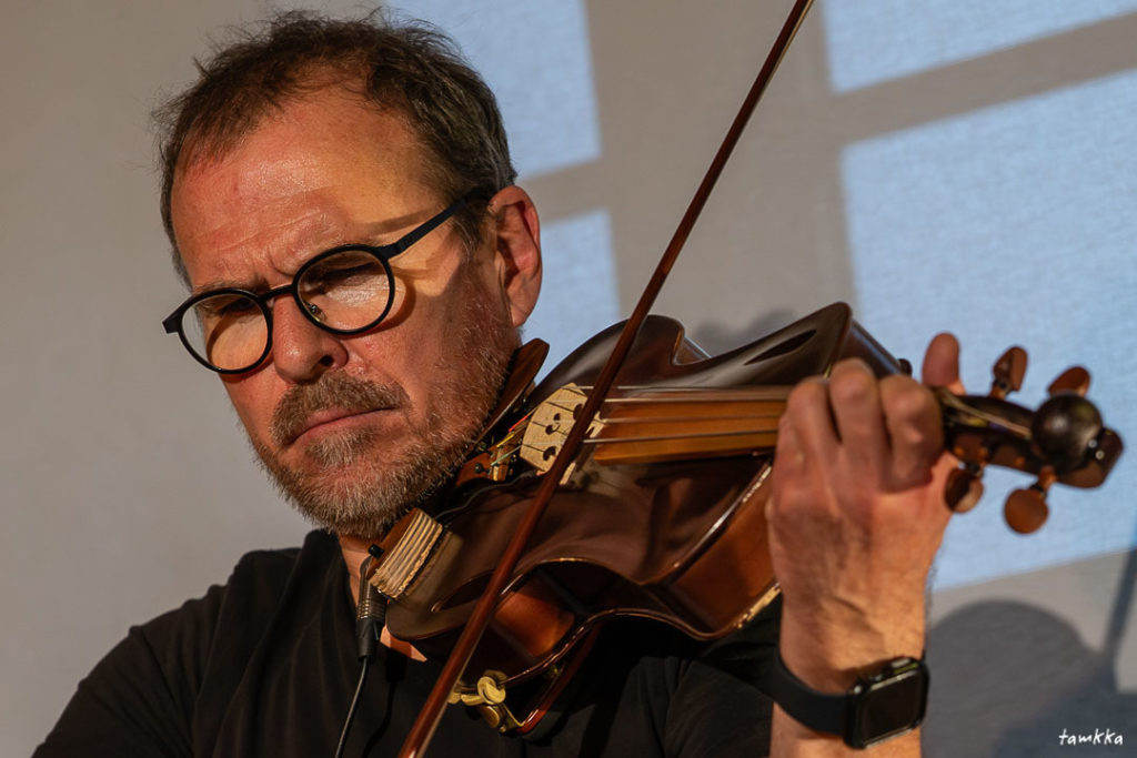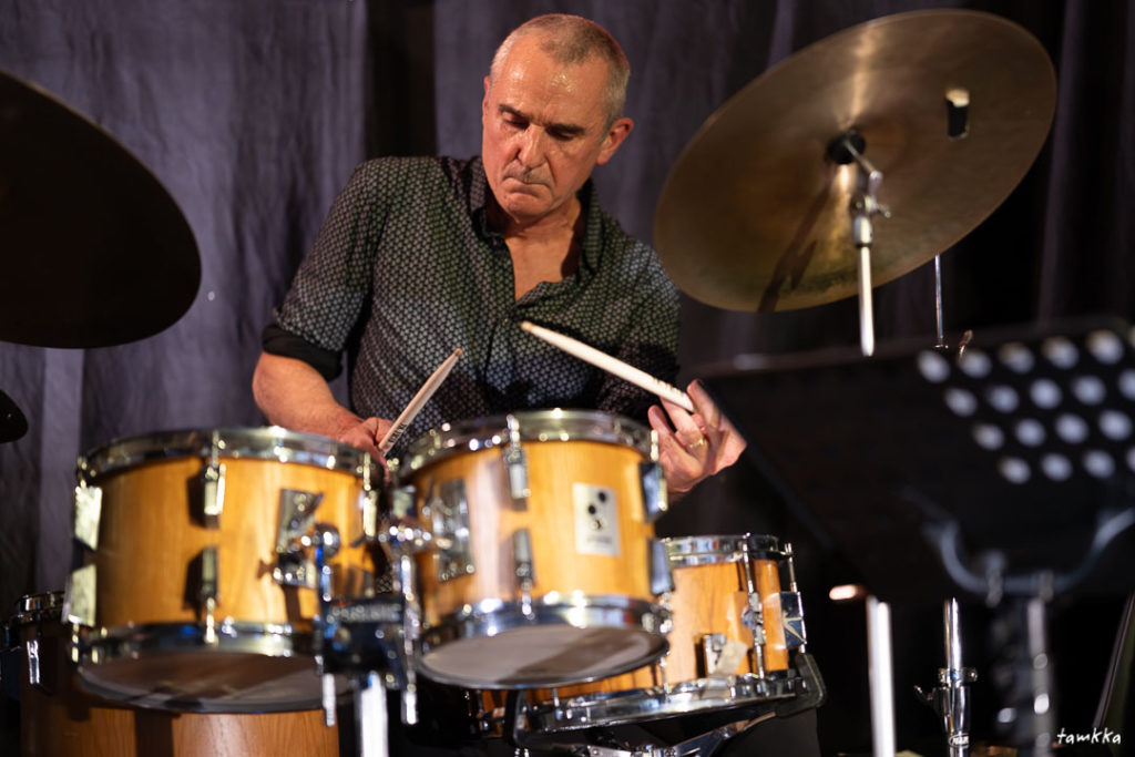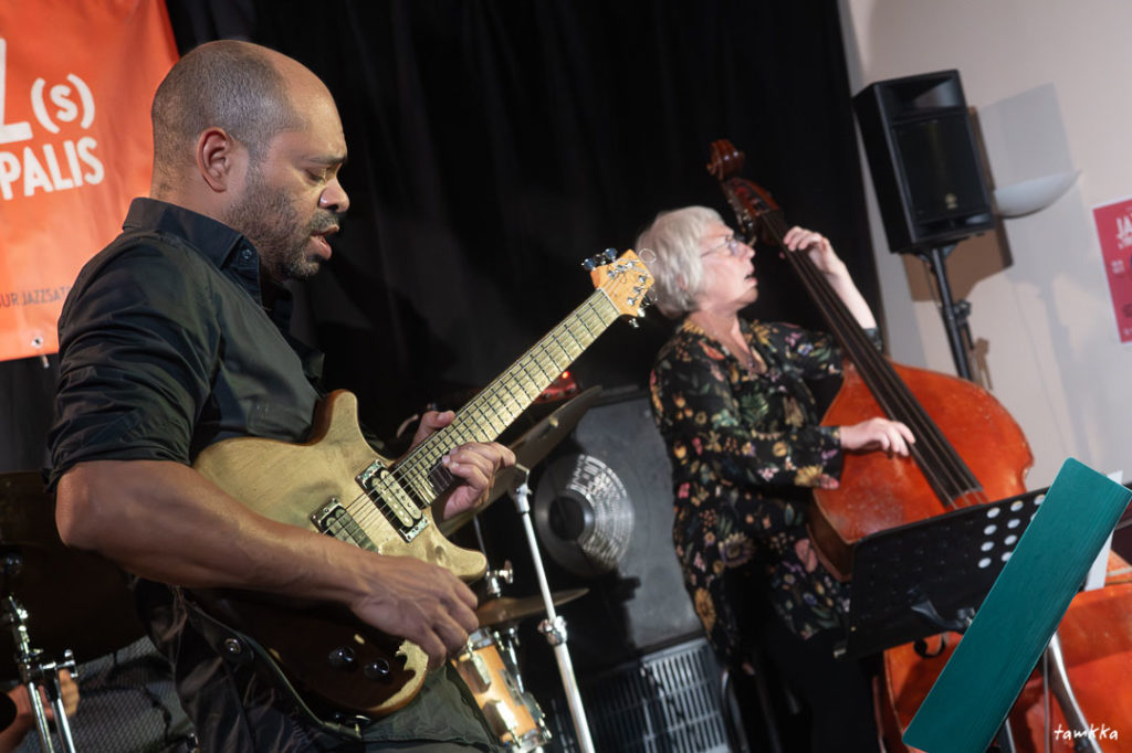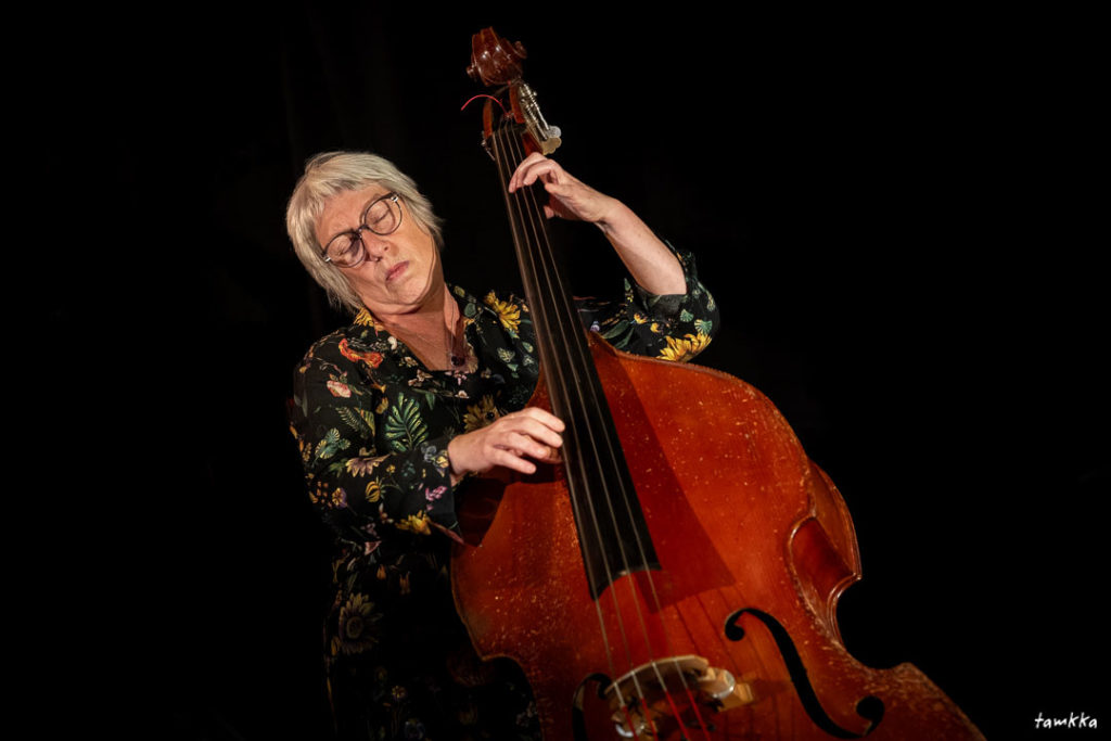 Difficile de décrire l’extrême richesse du jeu de Sylvain, savoir qu’elle émeut, le jazz et sa révolte toujours au cœur de l’impro, c’est certain, Coltrane en ombre portée, la Semaine sanglante, la Commune… Le swing se déplace comme un doux félin, un blues désarticulé et recomposé, à mille facettes Un moment de grâce. Quelques susurrements en slaps, conversation intime et toujours du swing au-dedans.