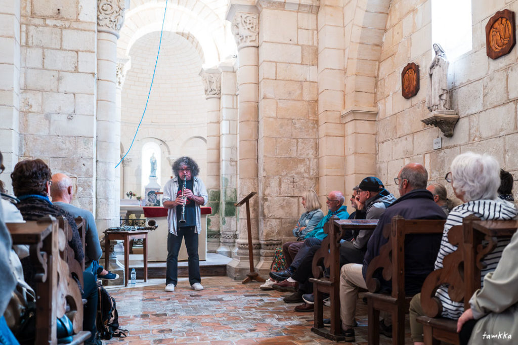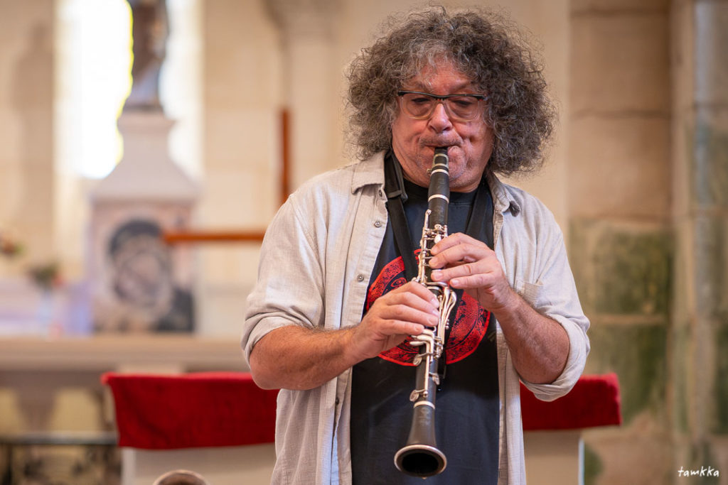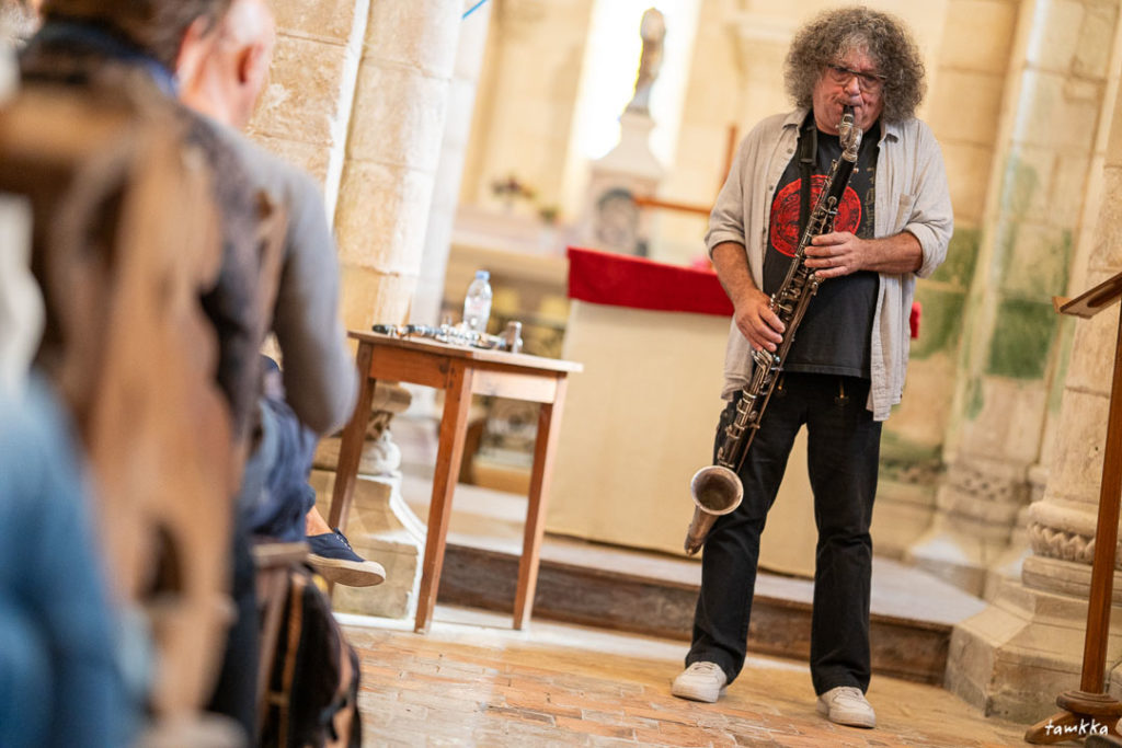 Je ne sais pas où est parti le regard de Sylvain Kassap mais trois secondes de concentration ont suffi pour que la clarinette souffle imperceptiblement dans une lande, à moins que l’église n’inspire le temps de la méditation. De multiples courants à la discrétion remarquable, frémissements variés, toucher de bambou, herbes ondulantes, éveil d’une nature insolite. Des virages délicats du son, contournements, passage de l’obscur à la lumière, des lumières, et la naissance progressive s’un blues détourné, Saint James infirmary, puissant ET aérien. La clarinette frisotte, se contorsionne, une respiration circulaire pour épuiser tous les possibles, peut-être chercher ce que le souffle peut encore quand il s’exténue.