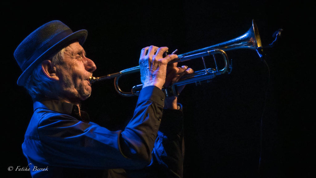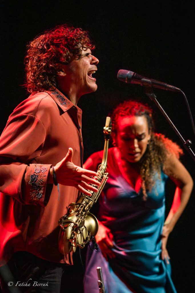 Une montée un peu martiale maintenue par la batterie de Manuel de la Torre, des accords élancés, des notes tenues pour la trompette d’Erik Truffaz puis les tourbillons du sax d’Antonio Lizana, la trompette s’y superposant, et la clarinette basse suave, lancinante, trace des strates de sensations. Les autres musiciens battent la mesure avec vigueur. Suit un duo voix/sax et la danseuse à la plastique impeccable se tend au service de l’intensité du baile.