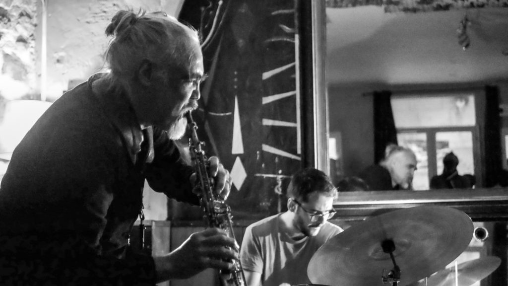 Ils commencent par un monde minuscule, frôlements, frisottements, aigus fréquencés. Jean fait siller une cymbale pour prolonger le son ensuite sur sa contrebasse, la batterie sursaute, un éveil progressif afin de libérer à nouveau du son, élever l’obstination, si fondamentale, pendant que la contrebasse rouille systématiquement le son, quelques éclats habilement dispersés sortent des mains d’Urbuli Baba. Le sax soprano de Roland s’excède, les slaps sont toujours amenés à bon escient, il suffoque parfois, vocifère. Les quatre instruments s’insurgent, réclament et battent le swing, insatisfaction bienvenue, faut pas se laisser faire.