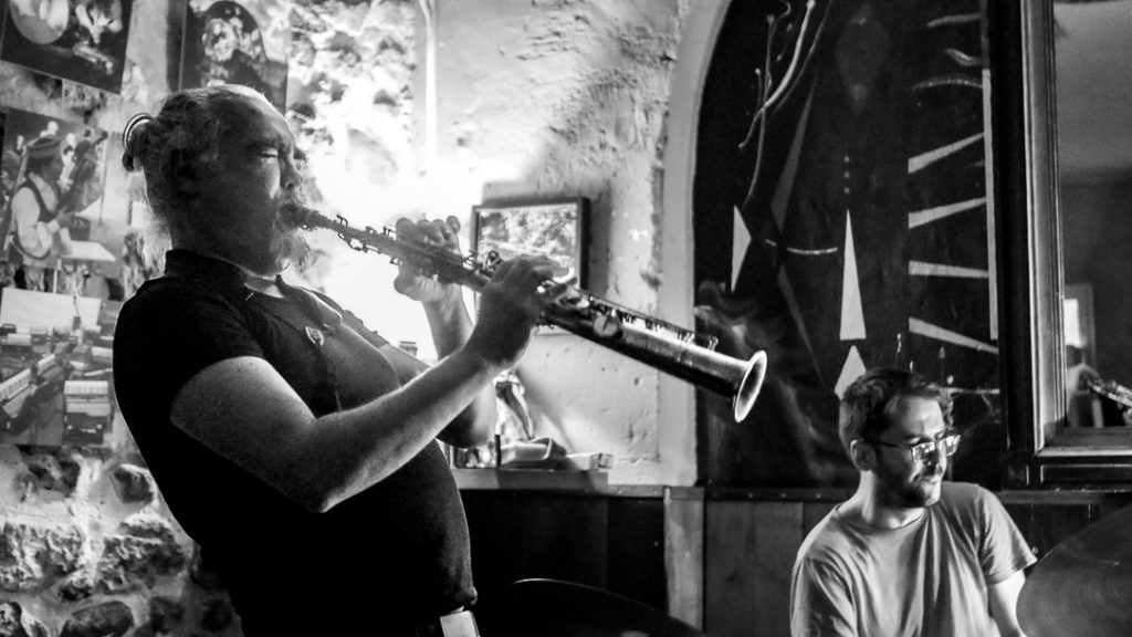Après, c’est la paix, ou un repos, la contrebasse s’étire, et ponctue aussi, moment d’intériorité grave, de méditation, c’est ptet pour ça que Jean-Luc prend sa clarinette basse, aux sons songeurs, sillonnants l’espace, vibrants pour s’ébrouer, prétexte à la contrebasse de s’exciter, et appeler le sax à les accompagner ; la puissance des instruments revient, anarchique. La batterie s’émancipe. Les belles couleurs de la contrebasse lancent des sons à mille teintes cuivrées. La clarinette basse en frisotte, grognant légèrement.