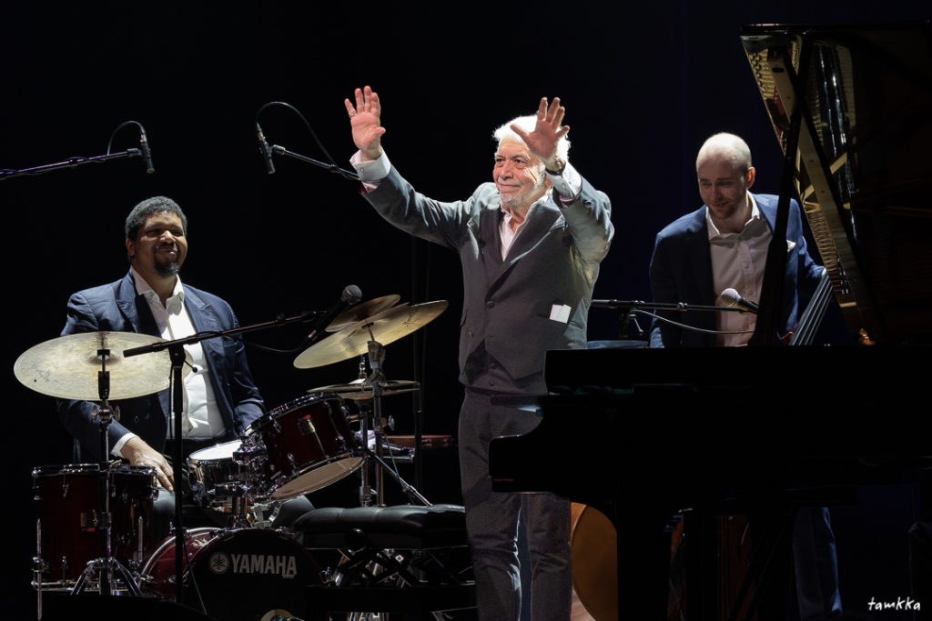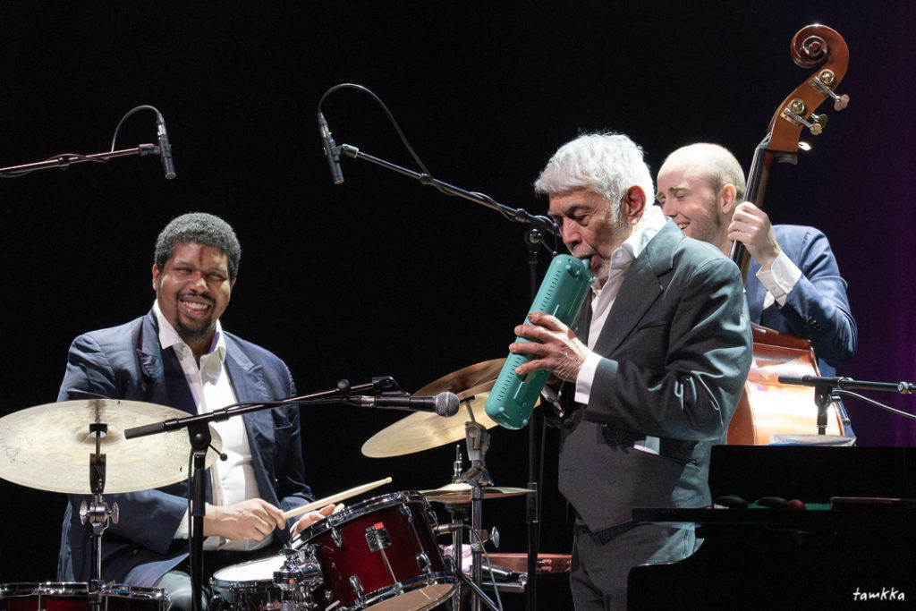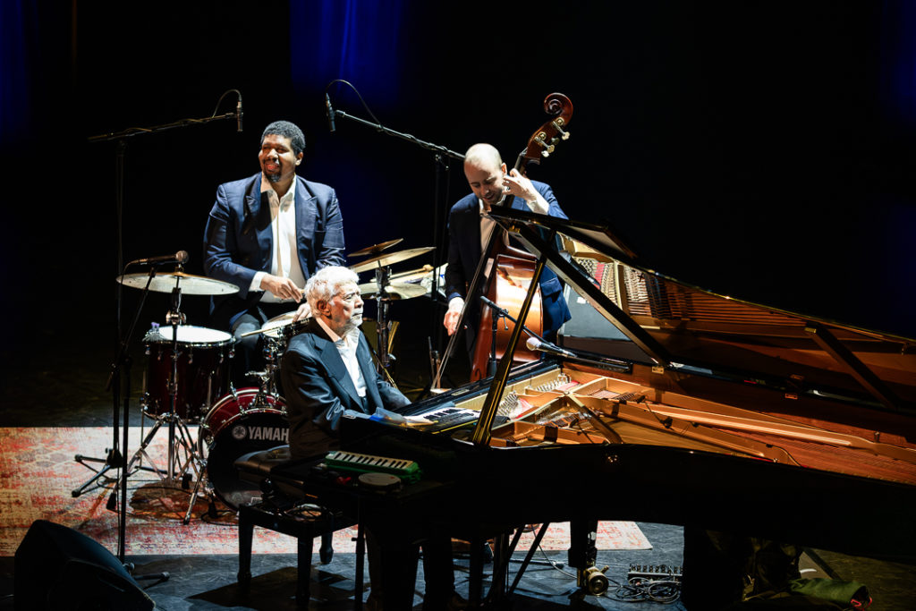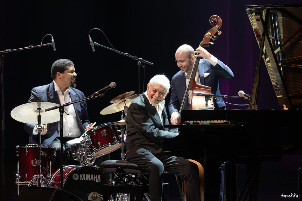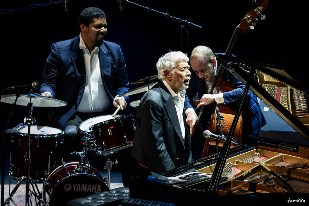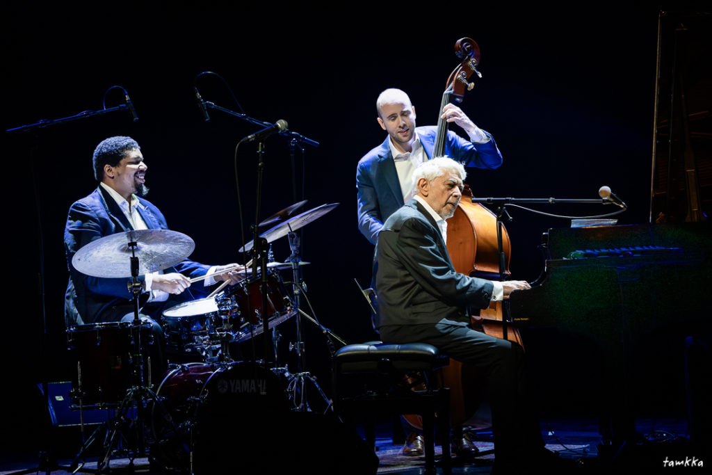 Le piano de Monty Alexander frétille, trémolos délicats pour que la musique papille, tangue, va sans dire que la batterie de Jason Brown roule, glisse pendant que la contrebasse de Luke Sellick gronde joyeusement. Les doigts de Monty dansent avec sa légèreté, son corps d’ailleurs, pas d’âge, rien qu’une gouleyante jeunesse, les doigts cherchent pourtant l’essentiel, ce qui vibrera le mieux.