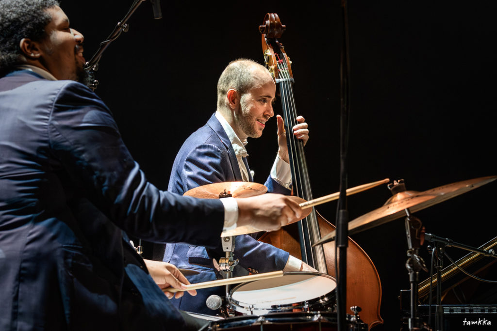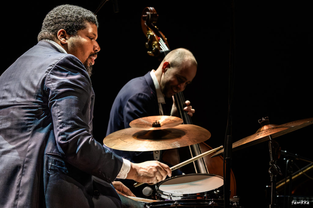 Et la jouissance des trois musiciens est joyeusement visible. Les accords tour à tour plaqués et sémillants sautant sur le clavier ; le doigté du contrebassiste lui aussi s’envole. La puissance de la batterie est au service de sa rapidité.