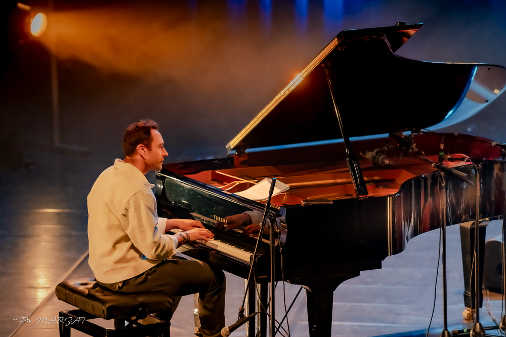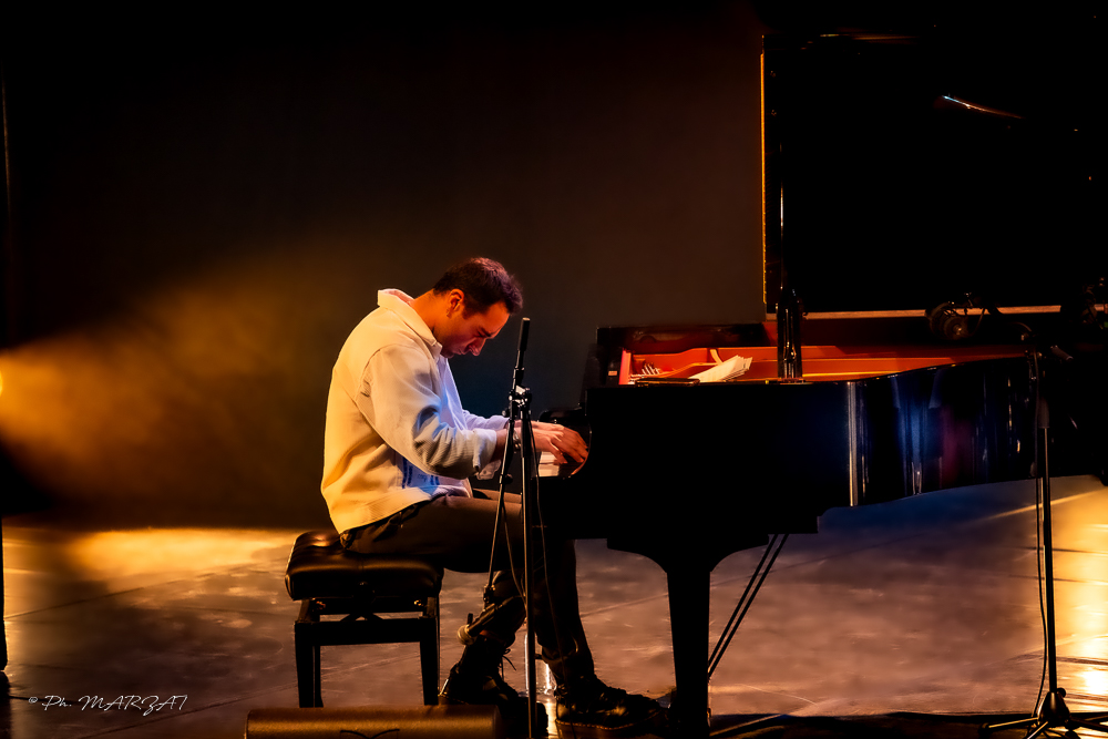 Une autre ambiance s’installe avec Sira Luntana. C’est une pièce au rythme dynamique en cinq temps écrite par l’américain Hermon Mehari. Grâce à l’ocre des lumières qui nimbe la scène, les brillantes digressions d’Enzo Carniel évoquent le charme intemporel d’une déambulation dans la vivante Catane.