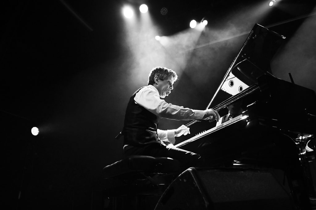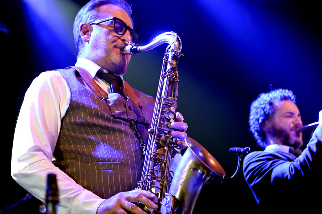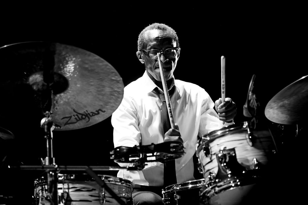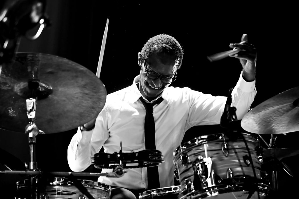 L’émotion est là dès le deuxième titre, ‟Footprintsˮ de Wayne Shorter, que l’on trouve sur le dernier album Straight Outta Palmer, une interprétation en douce énergie contenue des sax et trompette, la rythmique en retenue ambiance jazz club qui vire en syncope explosive, et ce piano léger, léger…‟Tanzillaˮ typé hard bop, c’est la puissance éclatante de Roger aux baguettes et le groove enveloppant de la contrebasse, une séquence solo au piano rappelant le thème, et toujours le duo magnifique qui se lâche, ça déménage et le public est au top ! Roger présente ses complices, commentaires et traits d’humour compris, remercie le son, les lumières, techniciens sans oublier le « stagiaire », avant d’entamer SON morceau, ‟From Palmerˮ, composition de 2009 sur laquelle le sax brode en équilibriste ses chorus ahurissants.