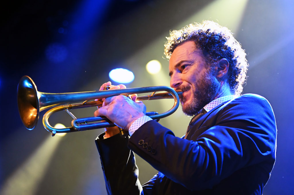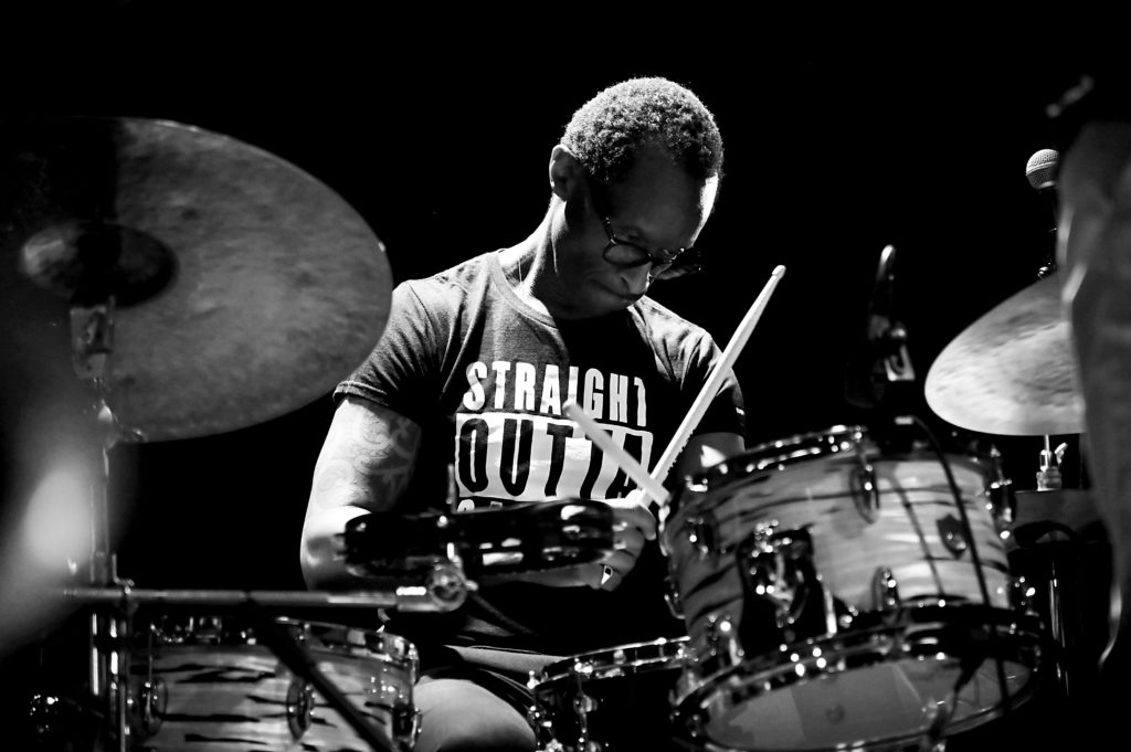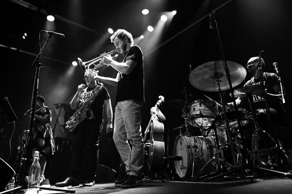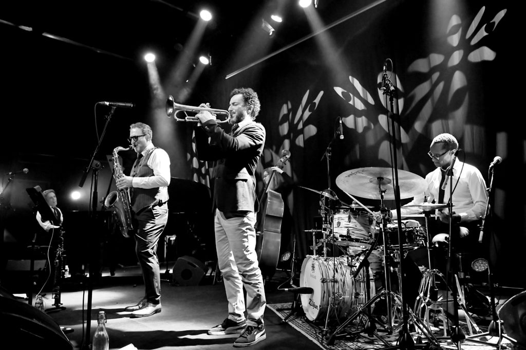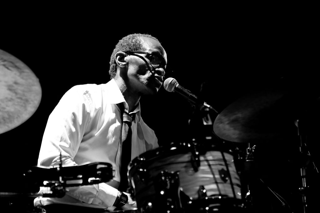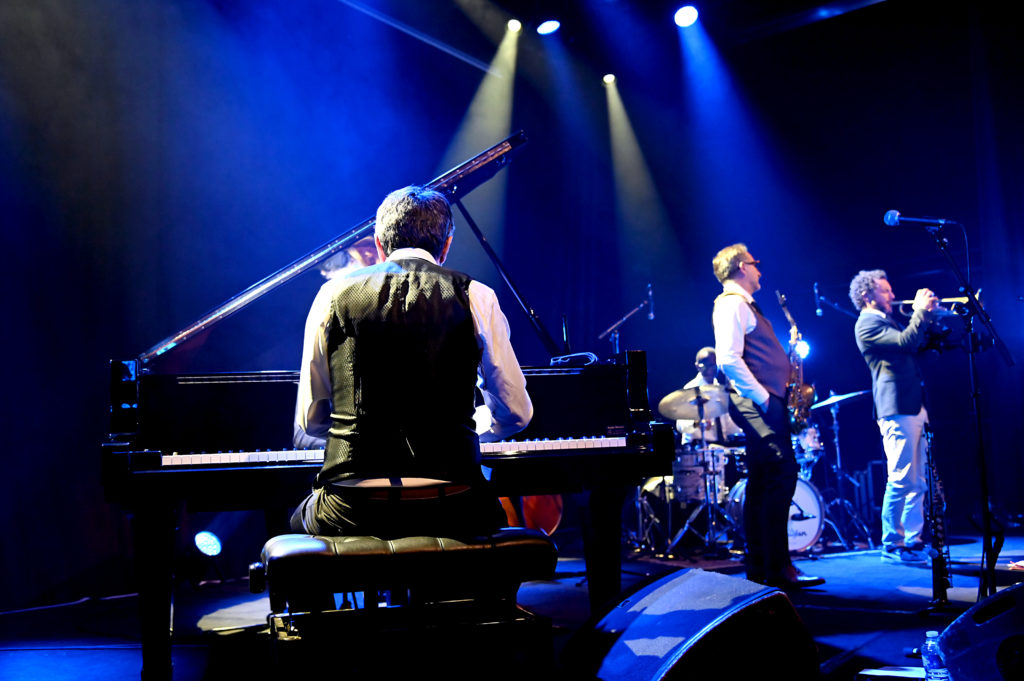 Entrée en scène de Roger ‟Kempˮ élégant, chemise blanche, qui s’installe derrière sa batterie, entame un solo comme il en a le talent pour accueillir ses complices de toujours : Hervé ‟Le Révérendˮ Saint-Guirons ce soir au piano, Nolwenn Leizour et sa contrebasse, puis les deux solistes, le saxophoniste Jean-Christophe Jacques et le trompettiste Mickaël Chevalier. Le quintet en place entame le premier titre ‟Generationˮ issu du deuxième album de Roger From Palmer ; une entrée en matière sur les chapeaux de roues, mené par une batterie qui claque et qui balance du groove, magistralement soutenue par la contrebasse de celle que Roger nomme affectueusement « La patronne », le piano toujours jubilatoire de Hervé ‟Le Révérendˮ, les soufflants dialoguant, jouant à l’unisson, deux musiciens qui se connaissent bien et s’apprécient, et cela s’entend.