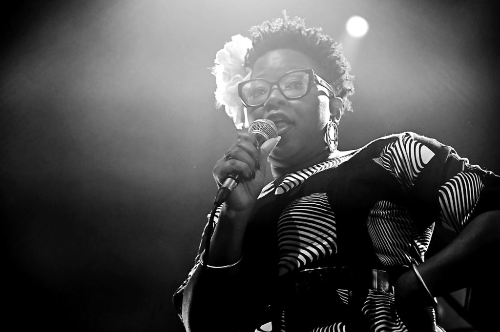 L’invitée de marque ce soir, Monique B. Thomas, l’« américaine de Créon » fait une entrée magistrale, interprétant la chanson de Mickaël Jackson, ‟Black or Whiteˮ, sur un arrangement swinguant ; puissance, clarté, sa voix au timbre chaud et doux à la fois est un régal d’émotion brute. Sur le morceau suivant, ‟Tightˮ de Betty Carter, piano contrebasse et batterie modèlent un écrin autour de la voix de Monique, d’où surgissent quelques accents de gospel, et dont le timbre est en accord parfait avec la trompette et le saxophone.