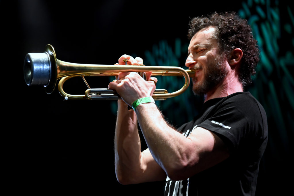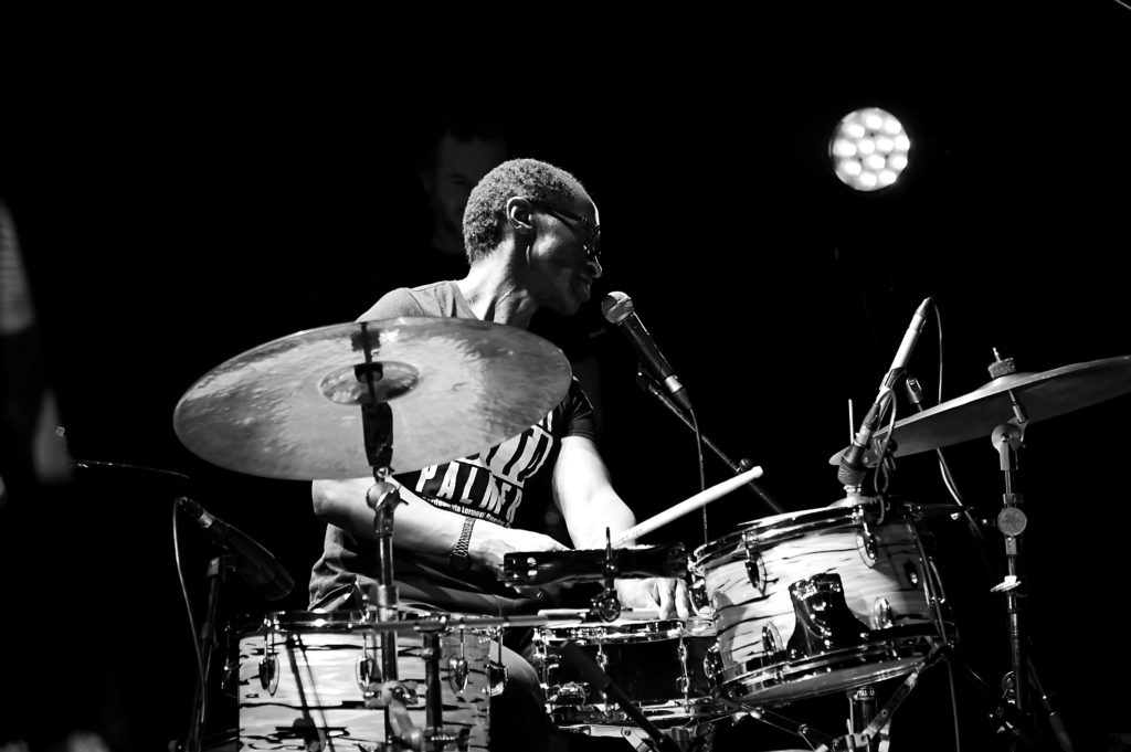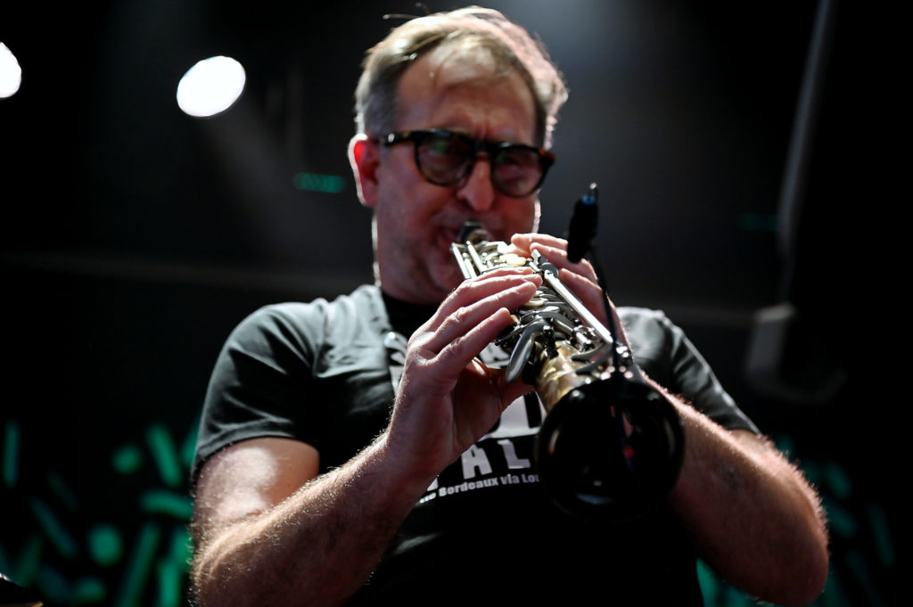 L’‟Essai après une attaque en première mainˮ, pour les afficionados du ballon ovale, un coup d’éclat du quintet déchaîné, l’échappée au coude à coude du batteur parti sur une autre planète et du saxophoniste pris de tremblements frénétiques, transmuté en vibratos échevelés, délire dans la salle ! Fabuleux moment de jazz ! Mais ça sent déjà la fin du set, et comme il a commencé, Roger seul en scène signe une séquence proprement époustouflante, quel batteur !